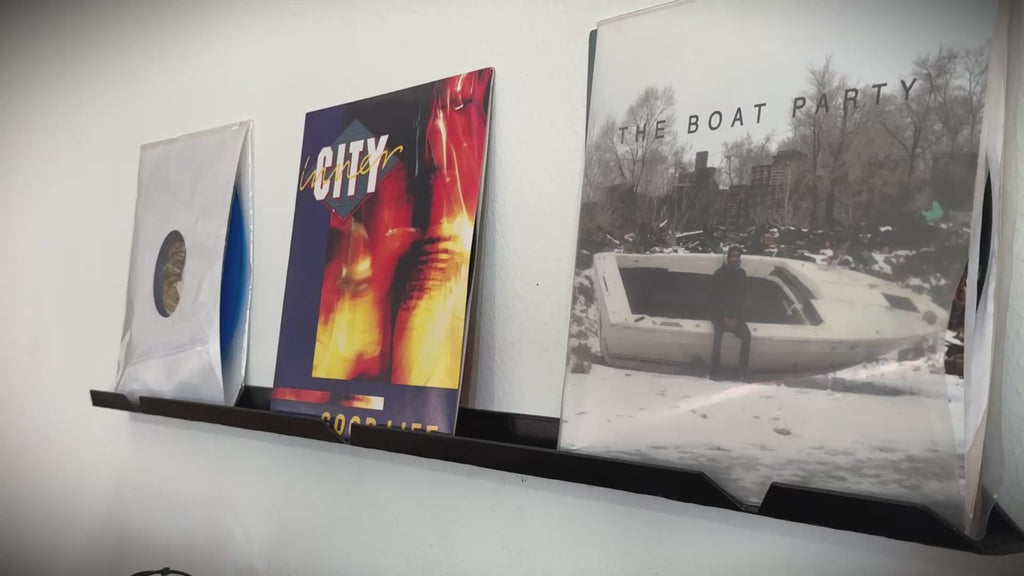 The Latitude Floating Record Shelf displays your music eye level and eliminates the need to bend over to flip through crates. The shelf comes in 14" and 46" lengths for 1-3 records.
